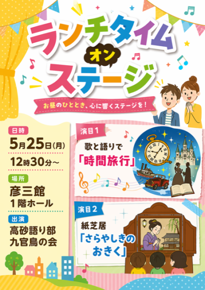 | 高砂一座発表会 日時:5月27日(水)AM10:00 場所:金沢駅東口地下広場(もてなし広場) 出演サークル ※ひまわり会 ※J・ハープクラブ ※フラダンスクラブ ※オカリナクラブ ※草笛愛好会 ※かがやき懐メロクラブ ※金沢ひびき会 ※高砂大学校同窓会 |